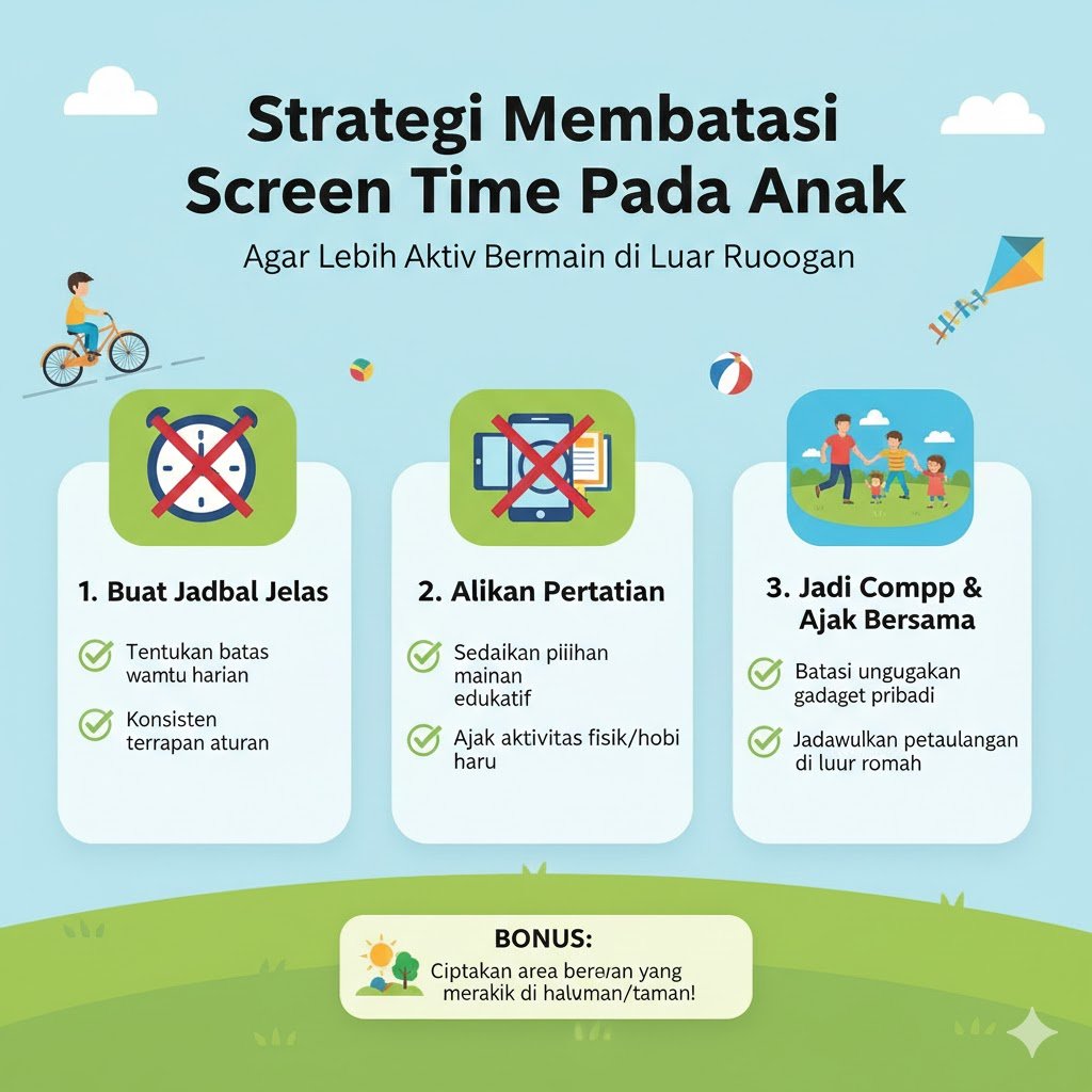 Era digital membawa tantangan besar bagi orang tua dalam menjaga keseimbangan antara penggunaan teknologi dan aktivitas fisik anak. Paparan layar yang berlebihan atau screen time sering kali membuat anak menjadi pasif dan enggan bergerak, yang dalam jangka panjang dapat memengaruhi kesehatan fisik serta perkembangan sosial mereka. Oleh karena itu, menerapkan strategi yang tepat sangat penting untuk mengalihkan perhatian anak dari gawai menuju kegembiraan bermain di alam terbuka yang lebih sehat dan dinamis.